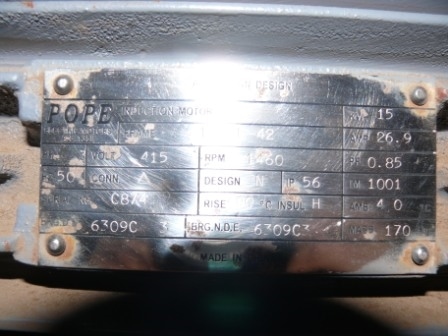 Make/Model: Pope Frame: 160 L – 42 Volts:415 Rpm: 1460 Kw: 15 HP:20
